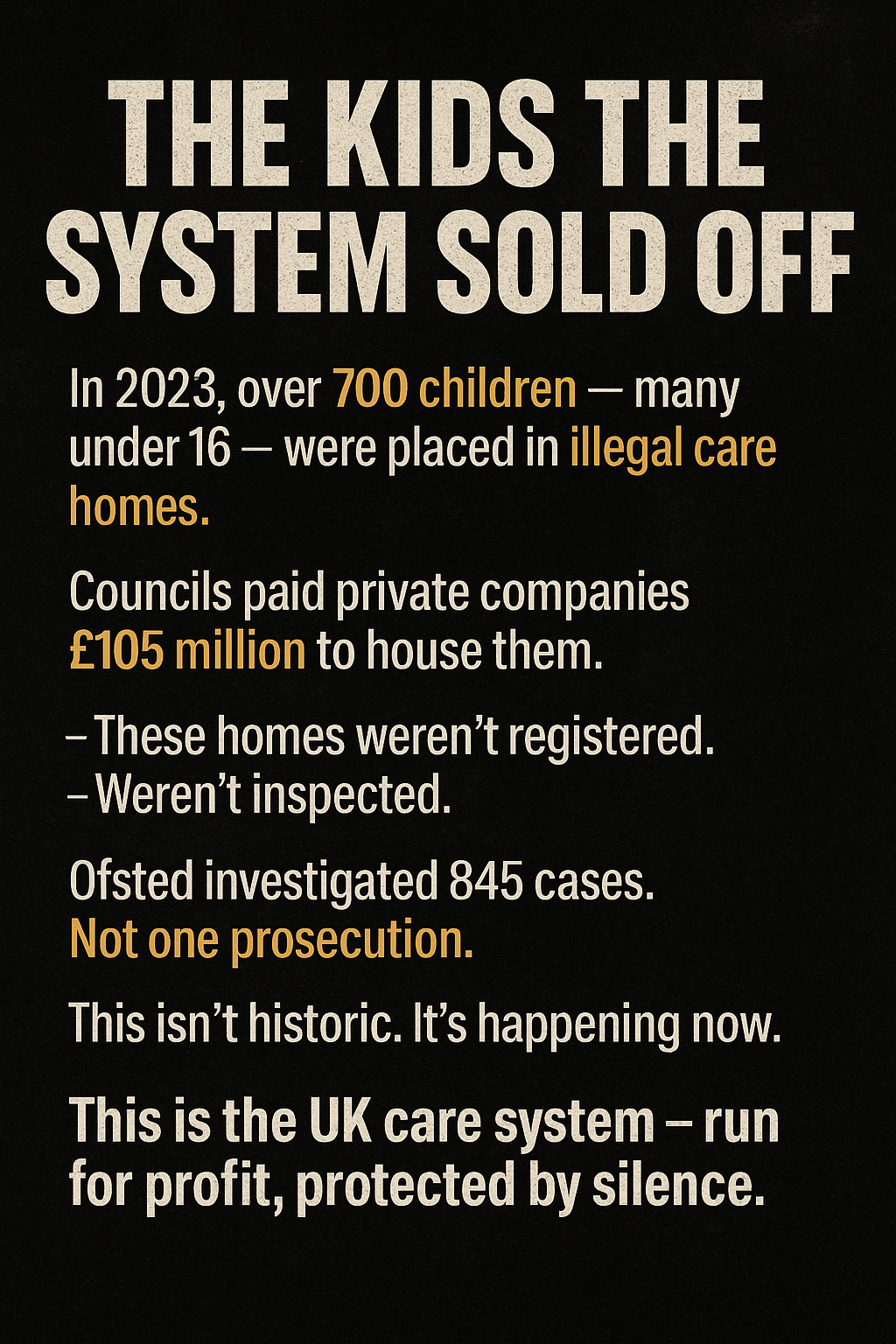 Children are being housed in illegal buildings, by untrained staff, under the noses of the very people paid to protect them. No more reviews. No more gentle guidance. What’s needed now is action — hard, urgent, unapologetic action.