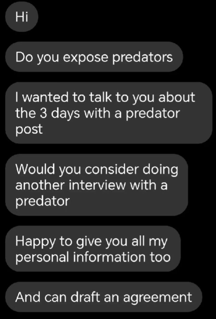 When a predator contacts me — or an exposure group — saying “I want to be exposed”, it is not a sign of reform.