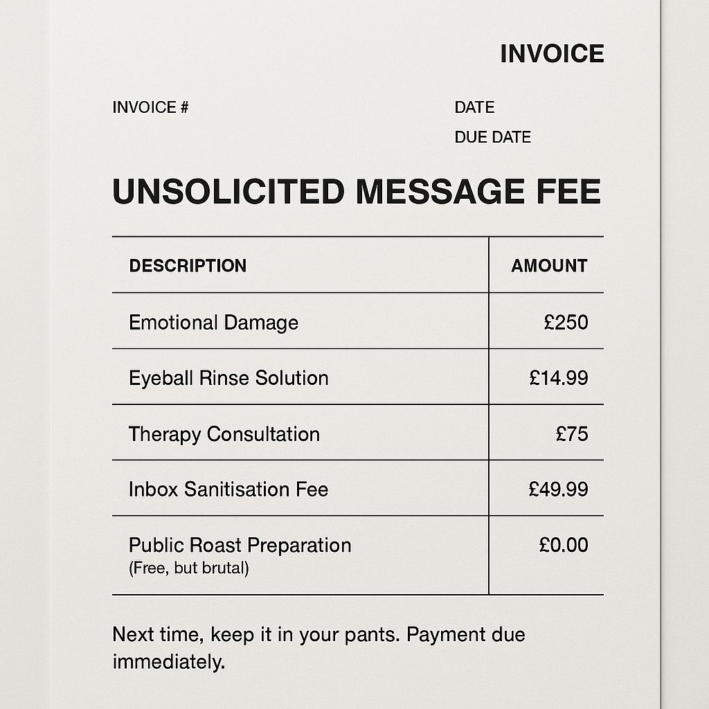 And no, you don’t get anonymity. You get my rage and a custom-built invoice. Consider this your one-time warning before you’re immortalised in a blog post titled “Why Your Cock Made Me Cringe So Hard I Pulled a Muscle.”