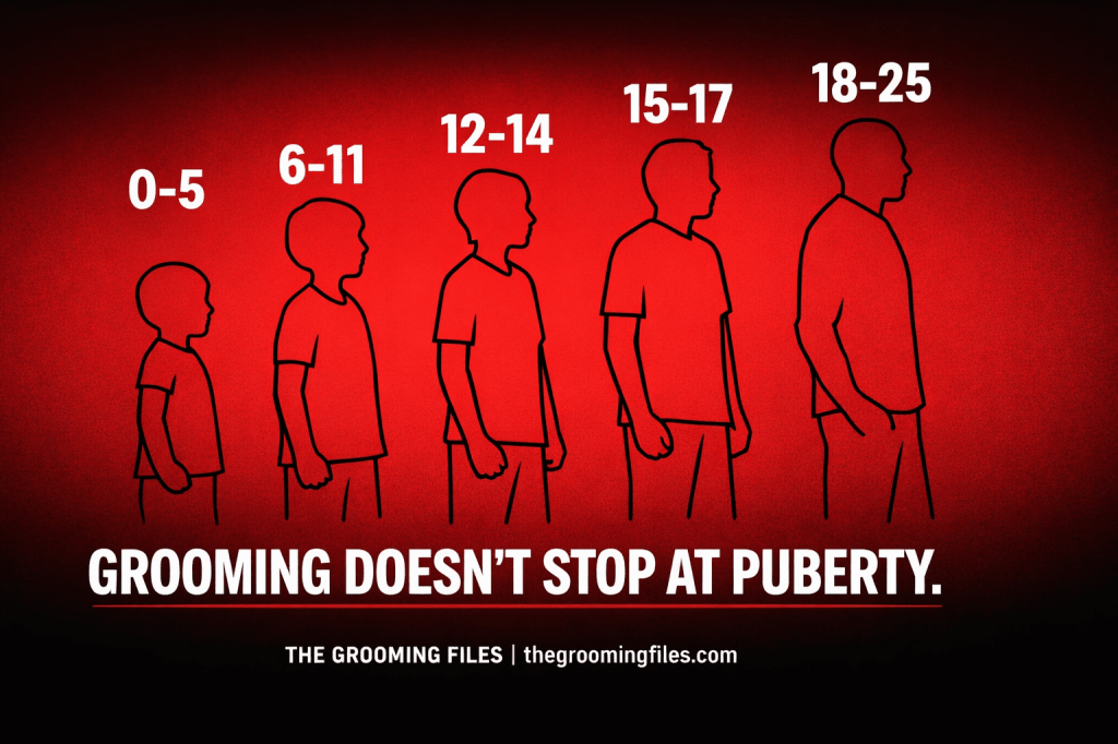 Grooming doesn’t stop at puberty. It doesn’t respect age boundaries. And it sure as hell doesn’t wait for vulnerability. It creates it.