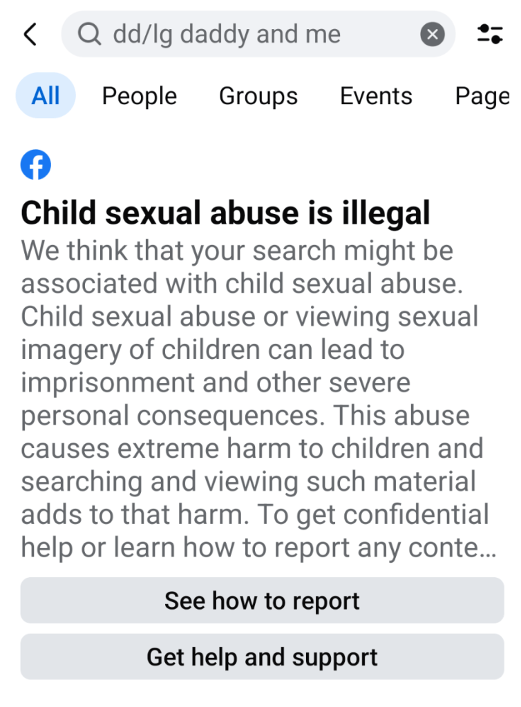 Facebook’s own system now flags the search term “DD/LG Daddy and Me” with a warning associated with child sexual abuse. Their own warning. Their own words.