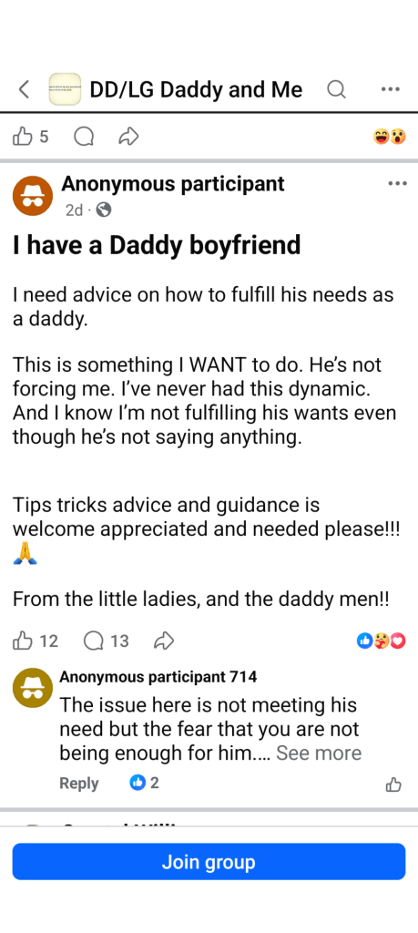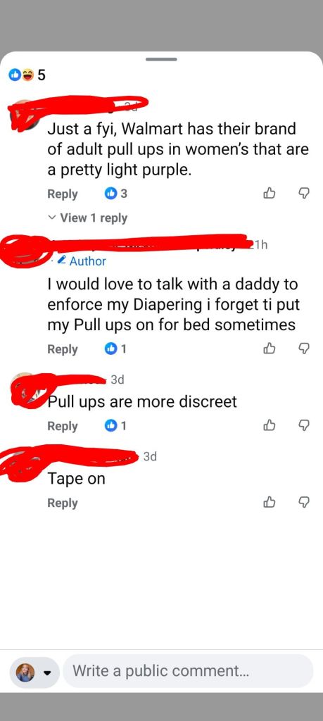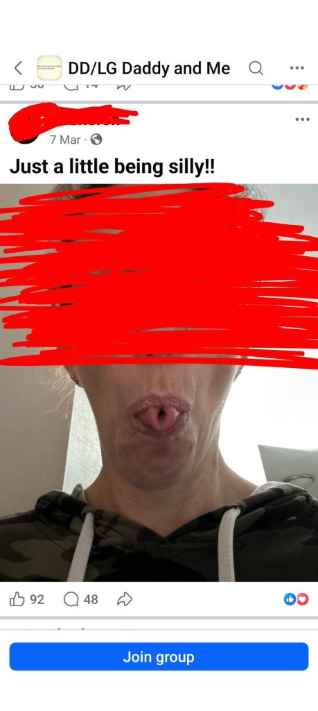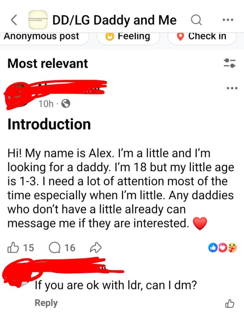 Facebook should be required, not asked, required, to make groups of this nature private by default. Genuine age verification should be a condition of access to any group whose content is built around age regression dynamics. The recommendation algorithm should not be surfacing this content in open feeds.